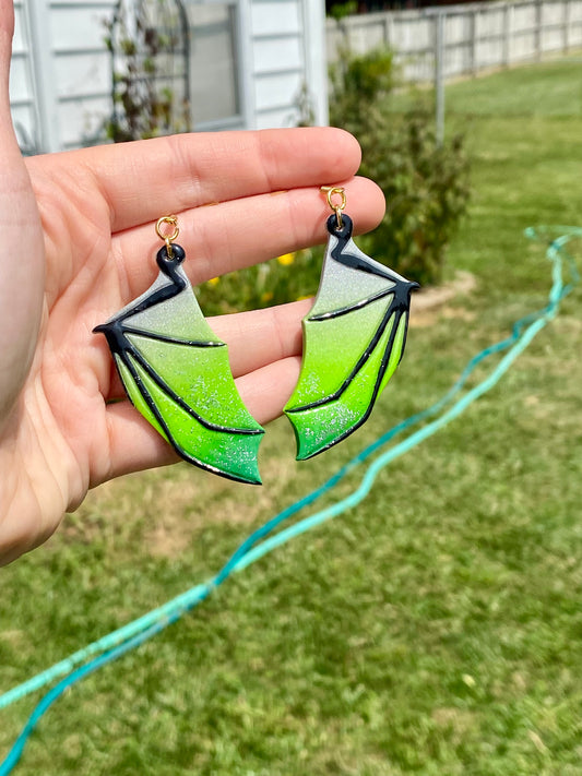 Enchanted Flight – Silver & Green Bat Wing Dangle Earrings