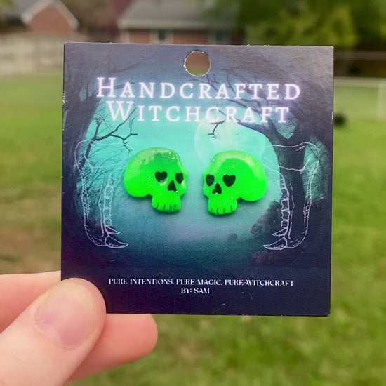 A fusion of dark enchantment and mystical energy, these hand-sculpted skull stud earrings embody both gothic elegance and witchy charm. Crafted from polymer clay, each skull fades from deep forest green to a luminous light green, with flecks of glitter catching the light like hidden magic. The black liquid clay accents highlight every carved detail, adding depth and intrigue.
