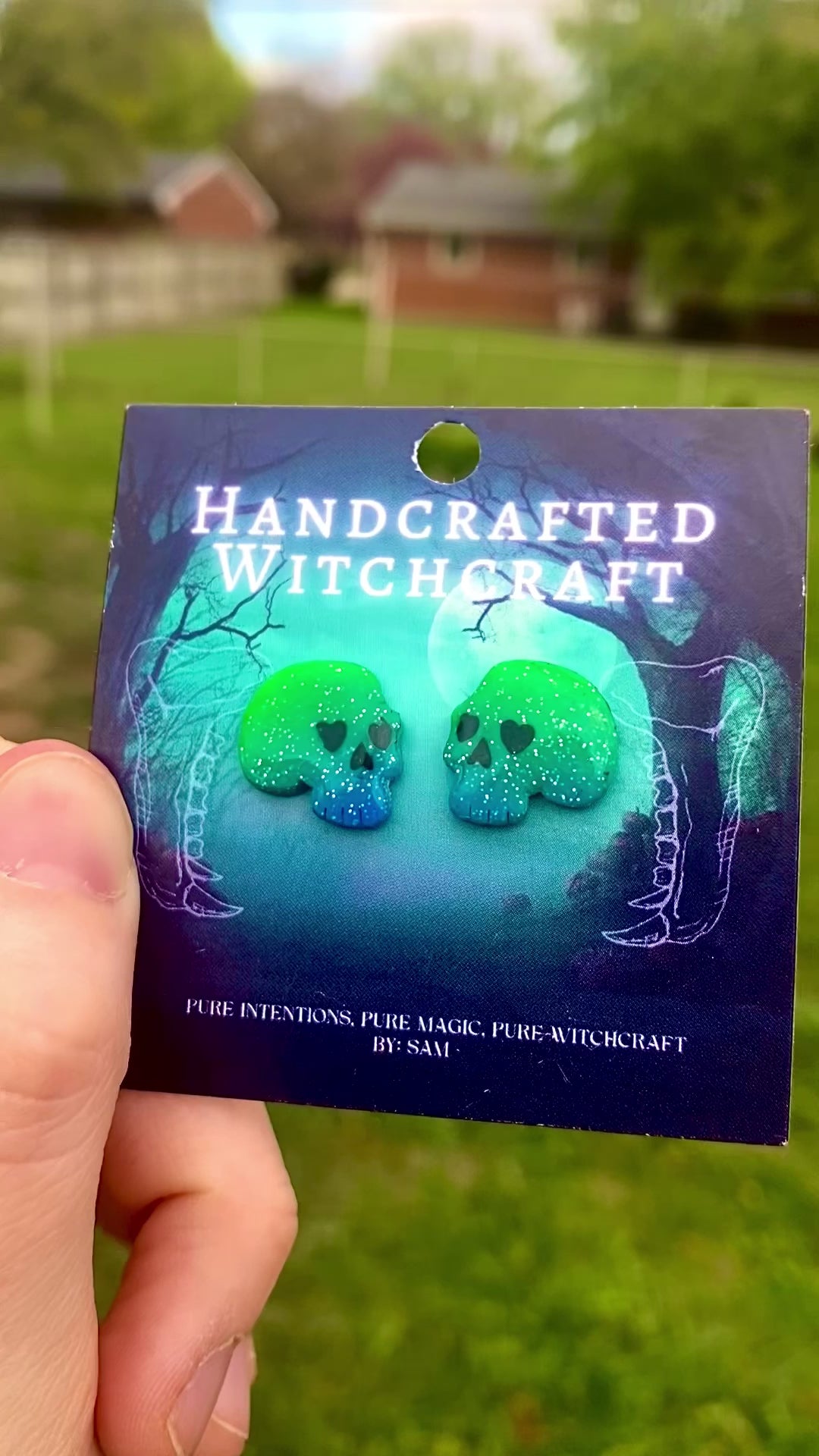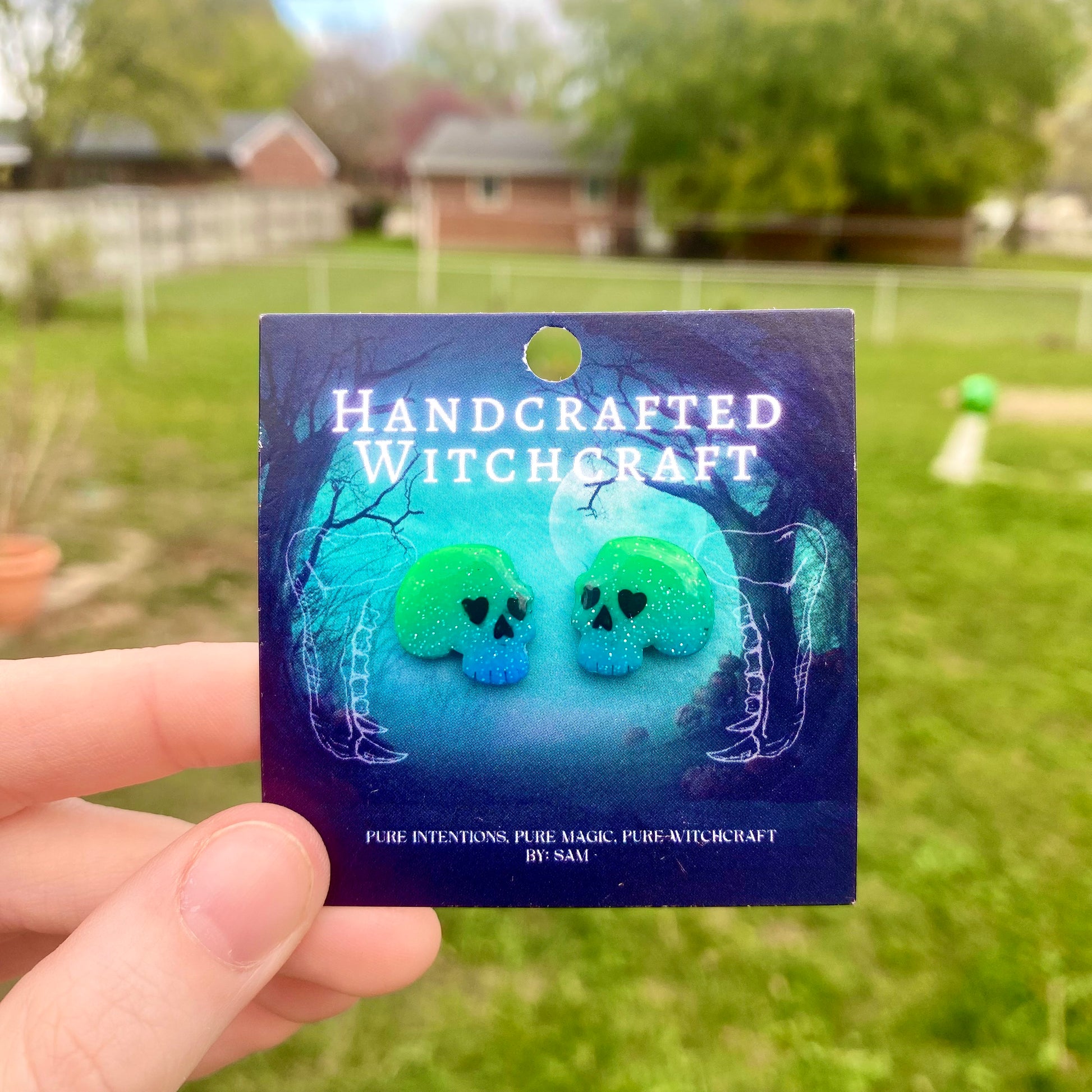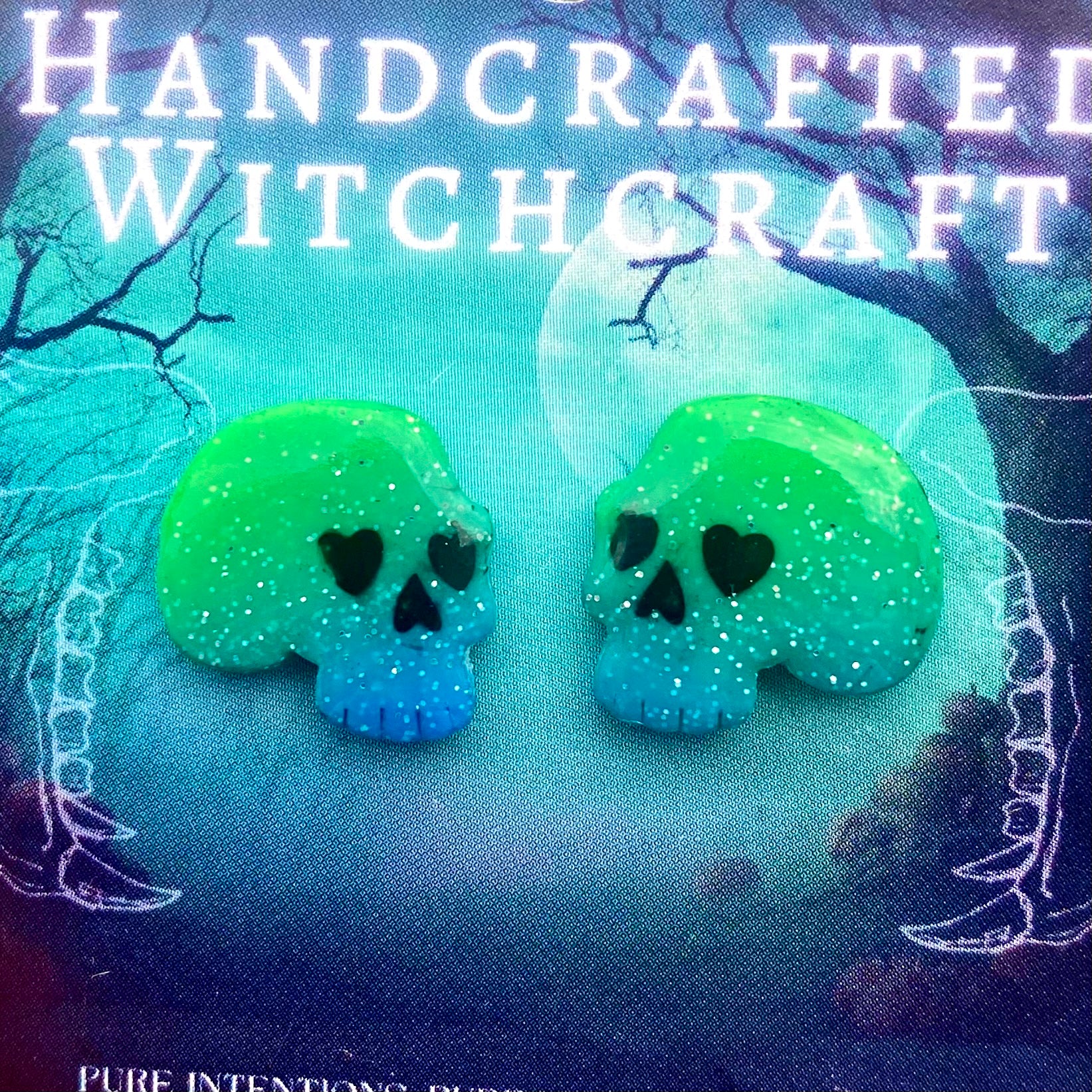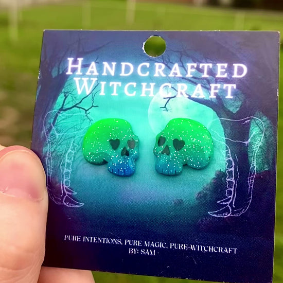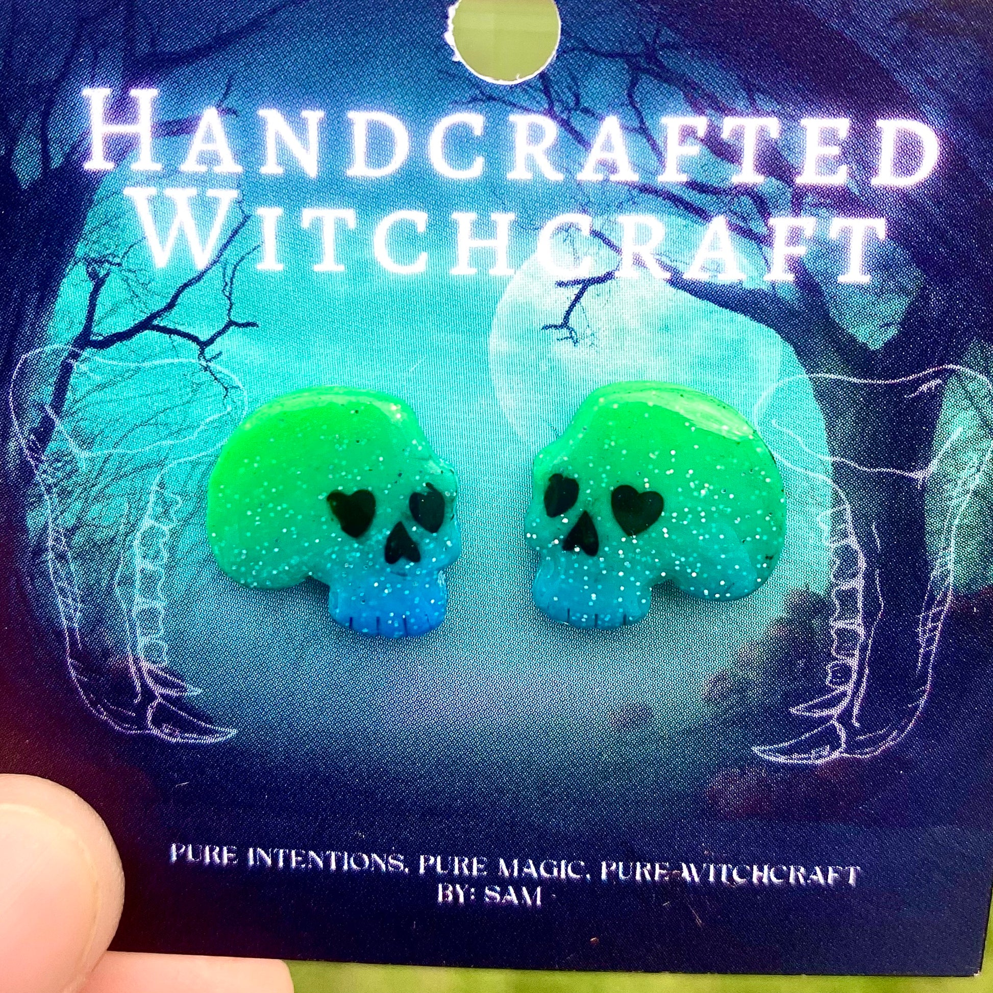 A fusion of earthly magic and oceanic mystery, these skull stud earrings are a whisper of the unknown. Handcrafted from polymer clay, they feature a smooth gradient of light green to deep, glittering blue, reminiscent of shifting tides and the veil between realms. Each crevice is carefully filled with black liquid clay, enhancing the intricate details that bring these tiny skulls to life.