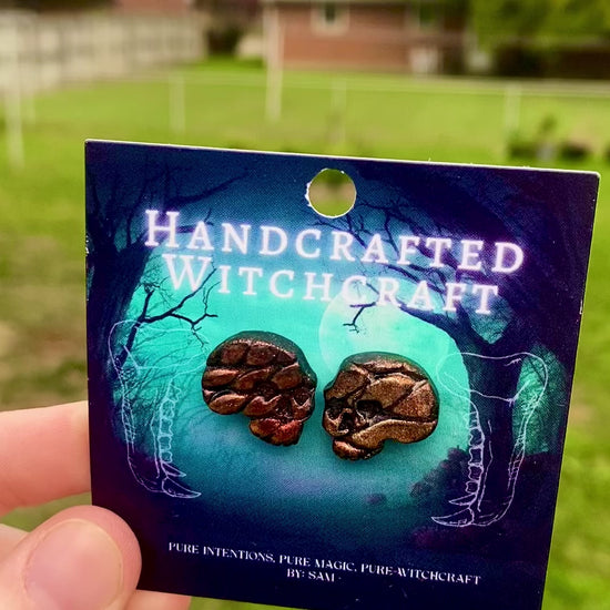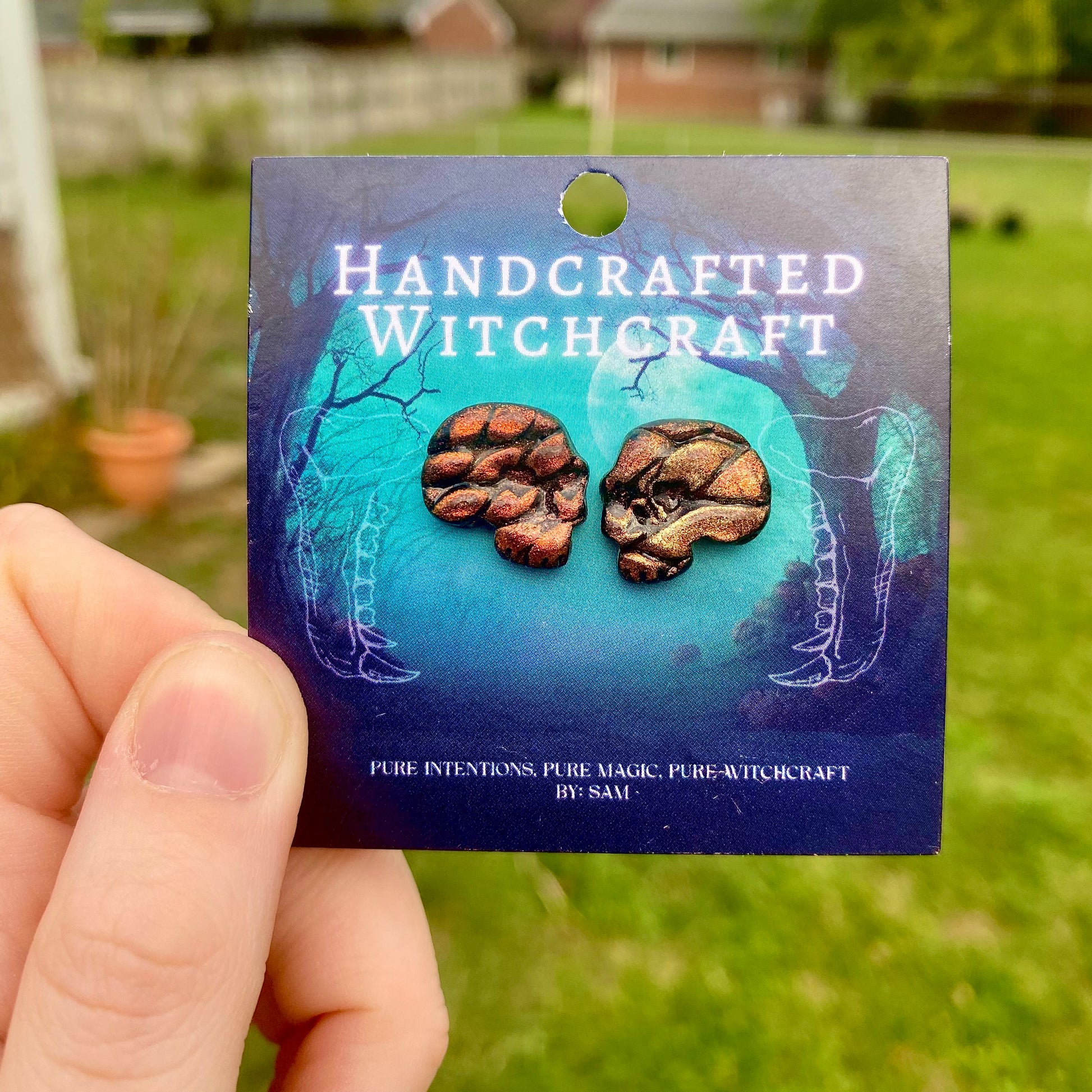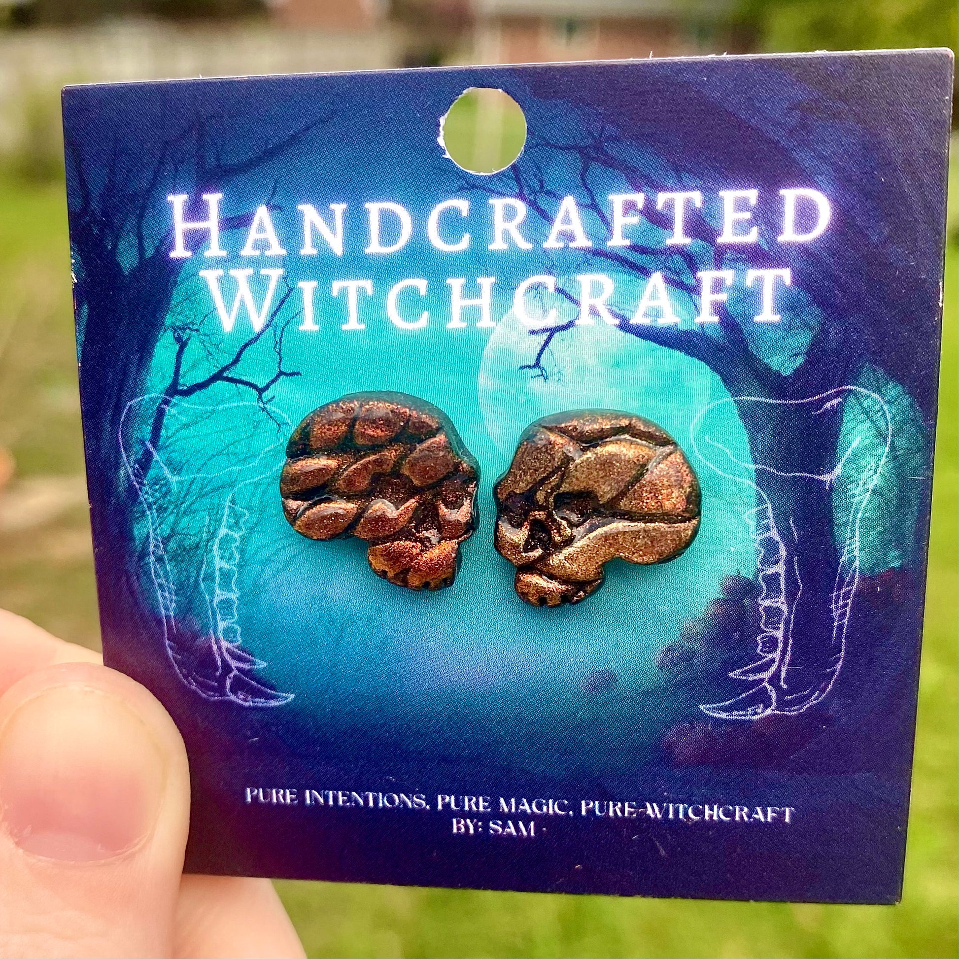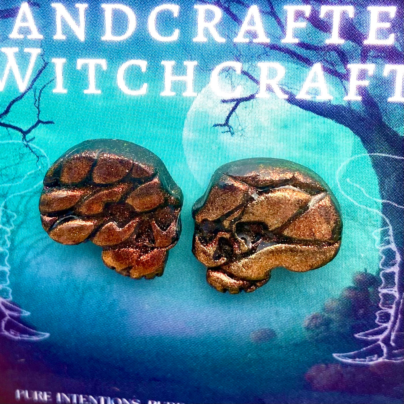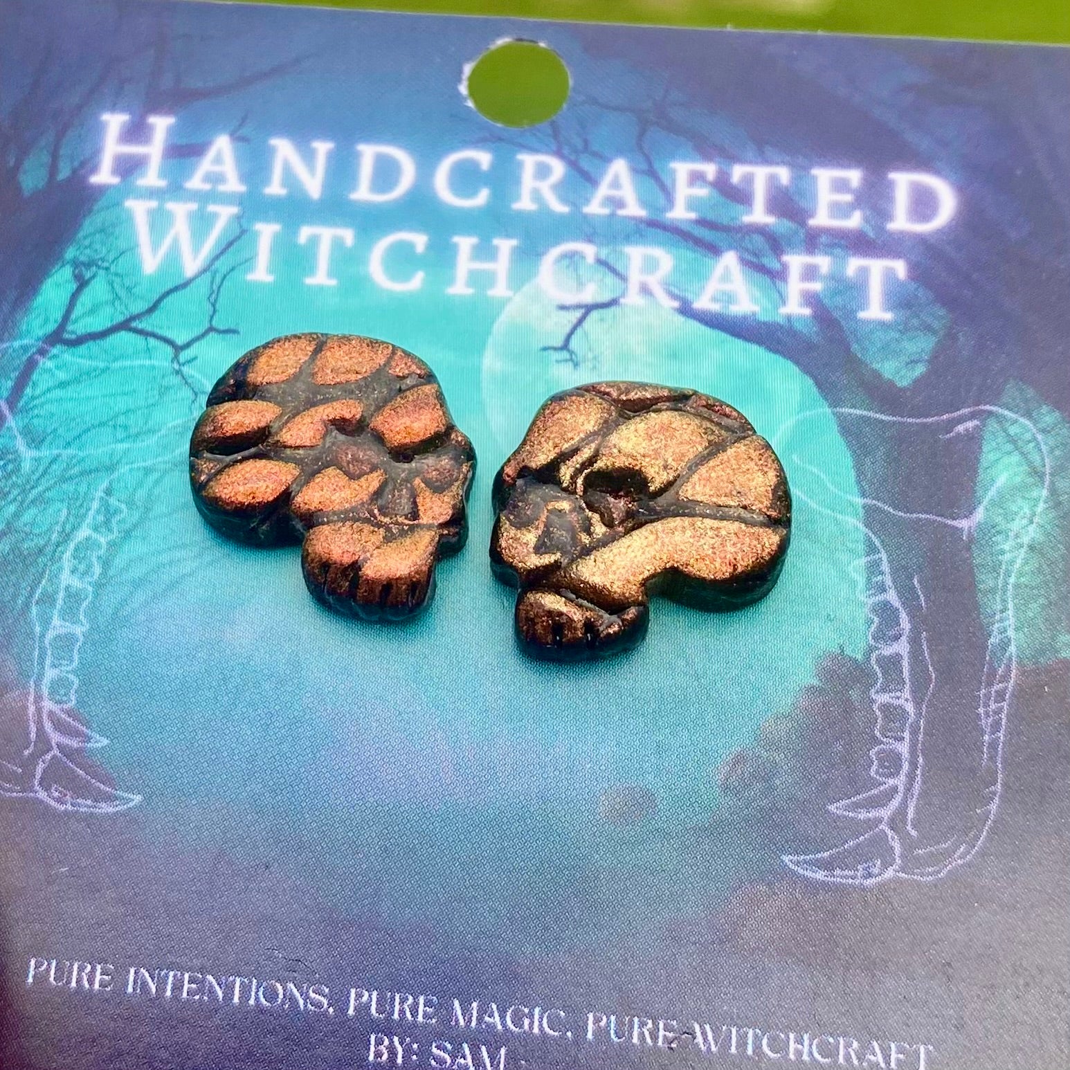 Dark elegance meets the mystique of the serpent with these hand-sculpted skull stud earrings. Crafted from polymer clay, each skull is coated in a mesmerizing red-shifting pigment, creating a snake-scale effect that shifts in the light—an omen of transformation, power, and hidden wisdom.