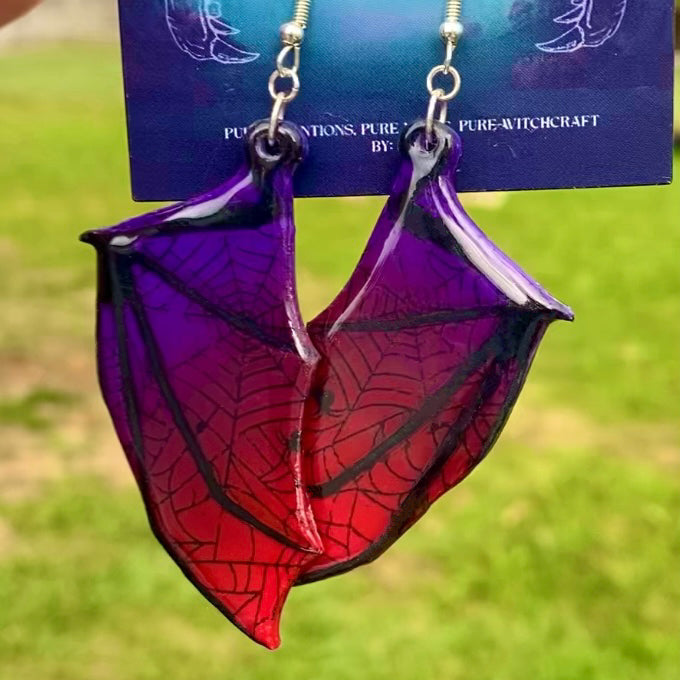 Bats have long been symbols of transformation, intuition, and the unseen mysteries of the night. These handcrafted polymer clay bat wing earrings capture that energy, shifting from a deep, moody purple to a rich blood red. A delicate spiderweb overlay adds an extra touch of gothic elegance, while the black liquid clay in the crevices highlights their intricate bone structure.