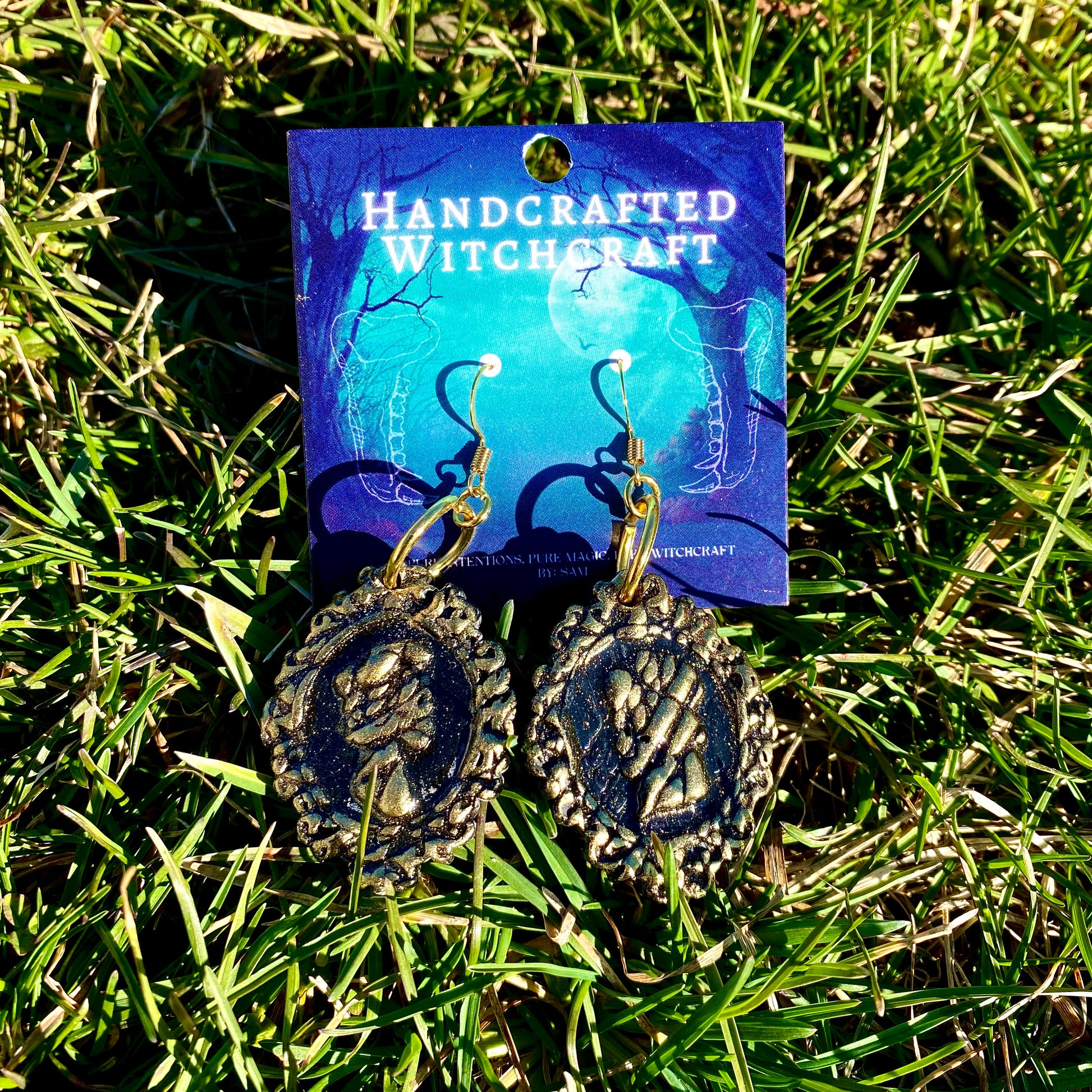 Timeless and bold, these earrings capture the essence of life and death, blending elegant craftsmanship with gothic charm. Featuring male and female skull cameos, each piece is set within a black handwoven polymer clay frame, evoking the beauty of the macabre. The gold pigment over the frame adds a regal touch, creating a stunning contrast against the deep, textured background.